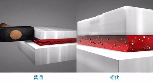 有几种方法可增加瞬干胶的韧性,但是最受欢迎的方式是使用橡胶或酸酐增韧剂。增韧剂是用来吸收和分散应用于粘合剂胶层的冲击和压力,获得更坚韧的粘结。韧化的瞬干胶:如果冲击负载,韧化的瞬干胶可通过吸收冲击力来防止开裂蔓延至粘层。此外,增强了热性能,并且在潮湿的环境下抗金属粘结。