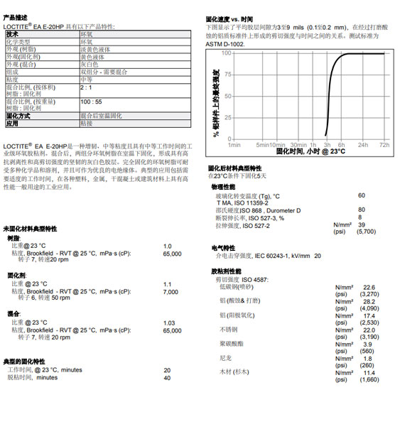 LOCTITE E-20HP是一种增韧、中等粘度且具有中等工作时间的工业级环氧胶粘剂。混合后,两组分环氧树脂在室温下固化,形成具有高抗剥离性和高剪切强度的坚韧的灰白色胶层。完全固化的环氧树脂可耐受多种化学品和溶剂,并且可作为优良的电绝缘体。典型的应用包括需要适度的工作时间,在各种塑料,金属,建筑材料上具有高性能一般用途的工业应用。如需乐泰E-20HP环氧树脂胶TDS、MSDS可以咨询