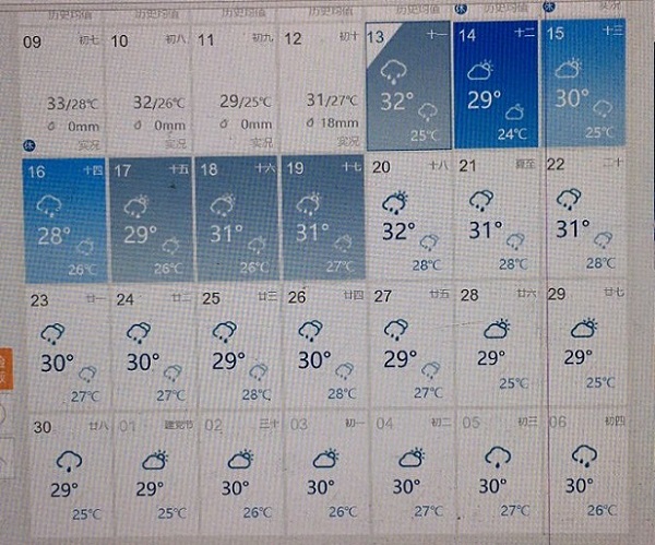 天气预报显示2019年6月15和16也暴雨。