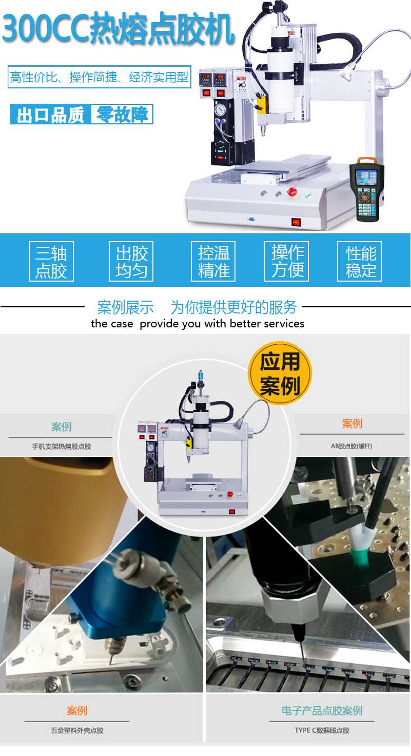 300ml 固科/Glueforce桌面型自动热熔胶点胶机TZ-PUR331R适​用于不同生产制造领域,广泛应用于精密五金行,塑胶行业,电子行业,家电行业行业等。适应胶水面广泛,如UV胶、环氧树脂,硅胶,AB胶、黑胶、白胶、PU胶、瞬间胶、红胶、锡膏、散热膏、聚胺脂等。