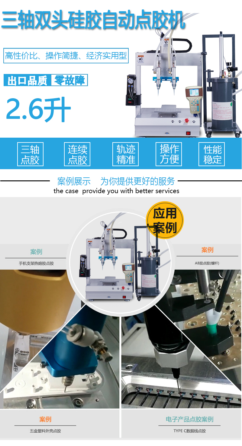 产品用途:固科/Glueforce三轴双头压力桶硅胶点胶机TZ-26GJ331S适用于工业生产的各个领域:手机按键、开关、连接器、电脑、数码产品、电子玩具、喇叭、蜂鸣器、电子元器件、电路板、LCD液晶屏、继电器、扬声器、晶振元件、LED灯、机壳粘接、光学镜头、机械部件密封