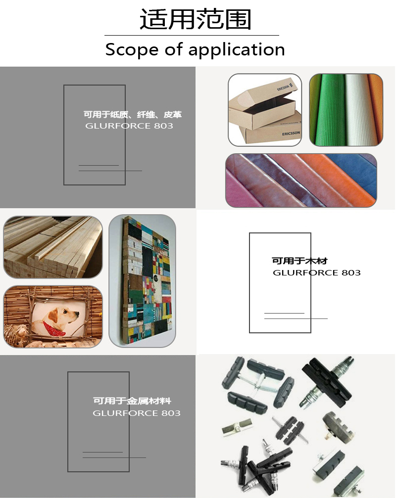 GLUEFORCE 803 特别适合于多孔易吸附的基材,例如木材,纸张,皮革,织物等的粘接。